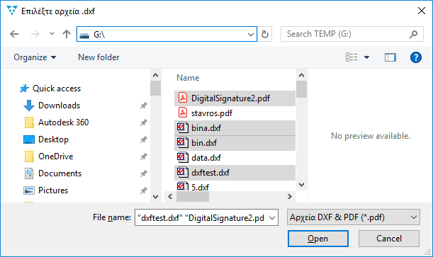 Επιλέξτε ένα ή περισσότερα αρχεία που θέλετε να υπογράψετε. Για τα αρχεία DXF δημιουργείται αυτόματα το αντίστοιχο αρχείο PDF με το hashcode που απαιτείται για την υποβολή των κτηματολογικών διαγραμμάτων.
